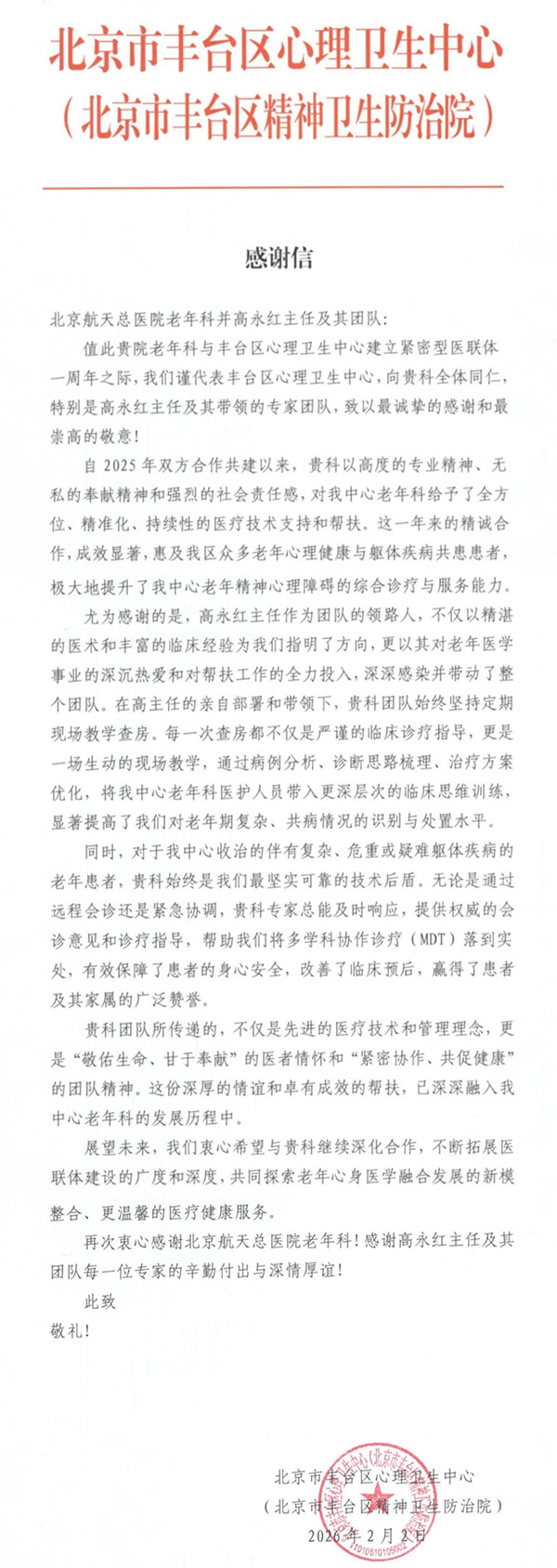 未来,我院老年医学科将以这封感谢信为动力,不忘初心、牢记使命,继续秉持“一切为了大众健康”的光荣使命,持续深化与北京市丰台心理卫生中心的医联体共建合作,不断精进医疗技术、优化服务流程、提升服务质量,把专业做到更精、把服务做到更细、把关怀做到更暖,继续深耕老年医疗领域,用专业与坚守、爱心与责任,守护好每一位老年朋友的健康与尊严,让夕阳之花绽放更绚丽的光彩。