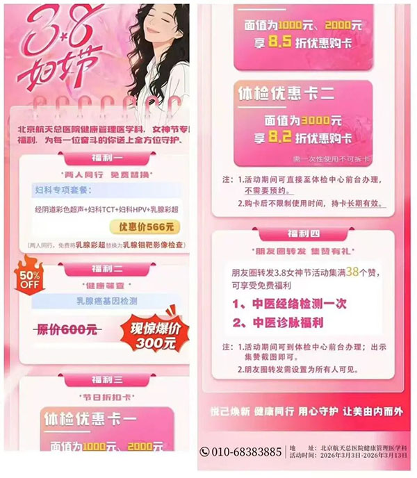 新春伊始,我们走进航天一院本级、华润医药等企业开展联合共建义诊,带来健康讲座、现场诊疗,推出优惠体检卡,把健康福利实实在在送到职工手中;学雷锋日,医护团队深入211厂,为离退休老人提供义诊咨询、养老政策解读、手机操作指导等服务,对行动不便的高龄老人上门问诊,让“老有所医”照进现实;三八女神节,专属女性健康福利暖心上线,推出乳腺、妇科检查等优惠套餐,开设女性常见病预防保健讲座,朋友圈集赞即可享免费中医经络检测、诊脉福利,用专业守护职场女性的健康与美丽。